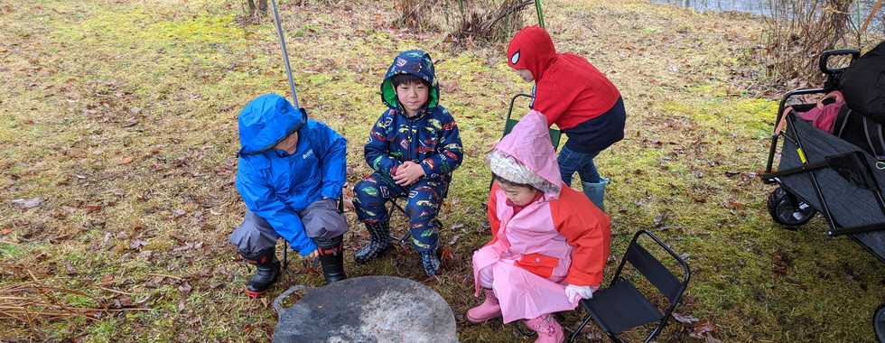 今日は、森の友達を作ることにしました。この日は雨が降っていたので、子どもたちと一緒に火を起こしました。お友達を作るために、最適なパーツを探しに森の中へ。子どもたちは、森の葉っぱの大小や形の違いに夢中になっていました。朽ち果てた切り株に生えているキノコは、その大きさを議論しながら、英語の単語を教える良い機会となりました。また、落ちていた蜂の巣を見つけ、子どもたちは興味深く観察していました。この森では、子どもたちが一人で歩き回れるスペースを確保できたので、子どもたちは景色を楽しみながら進んでいきました。
